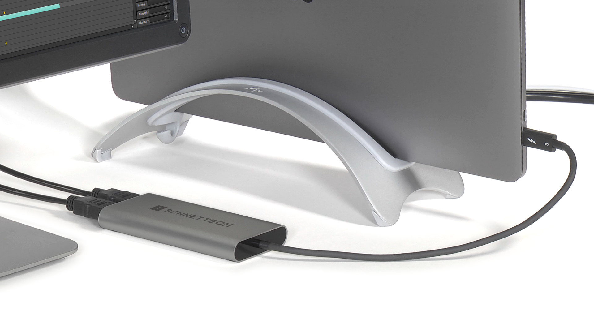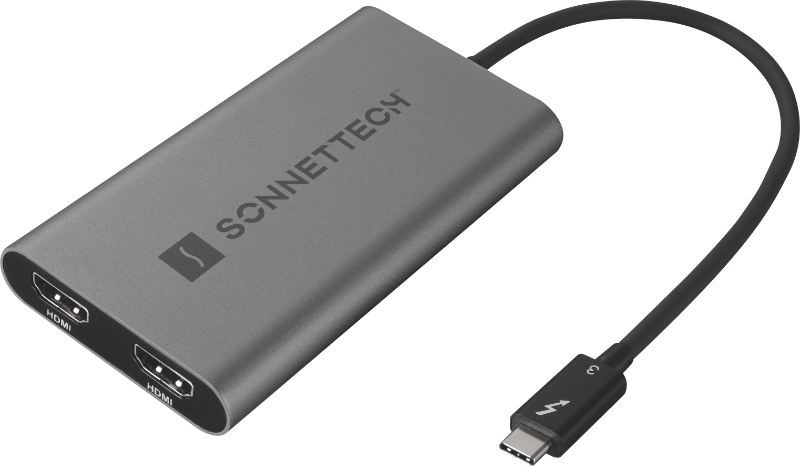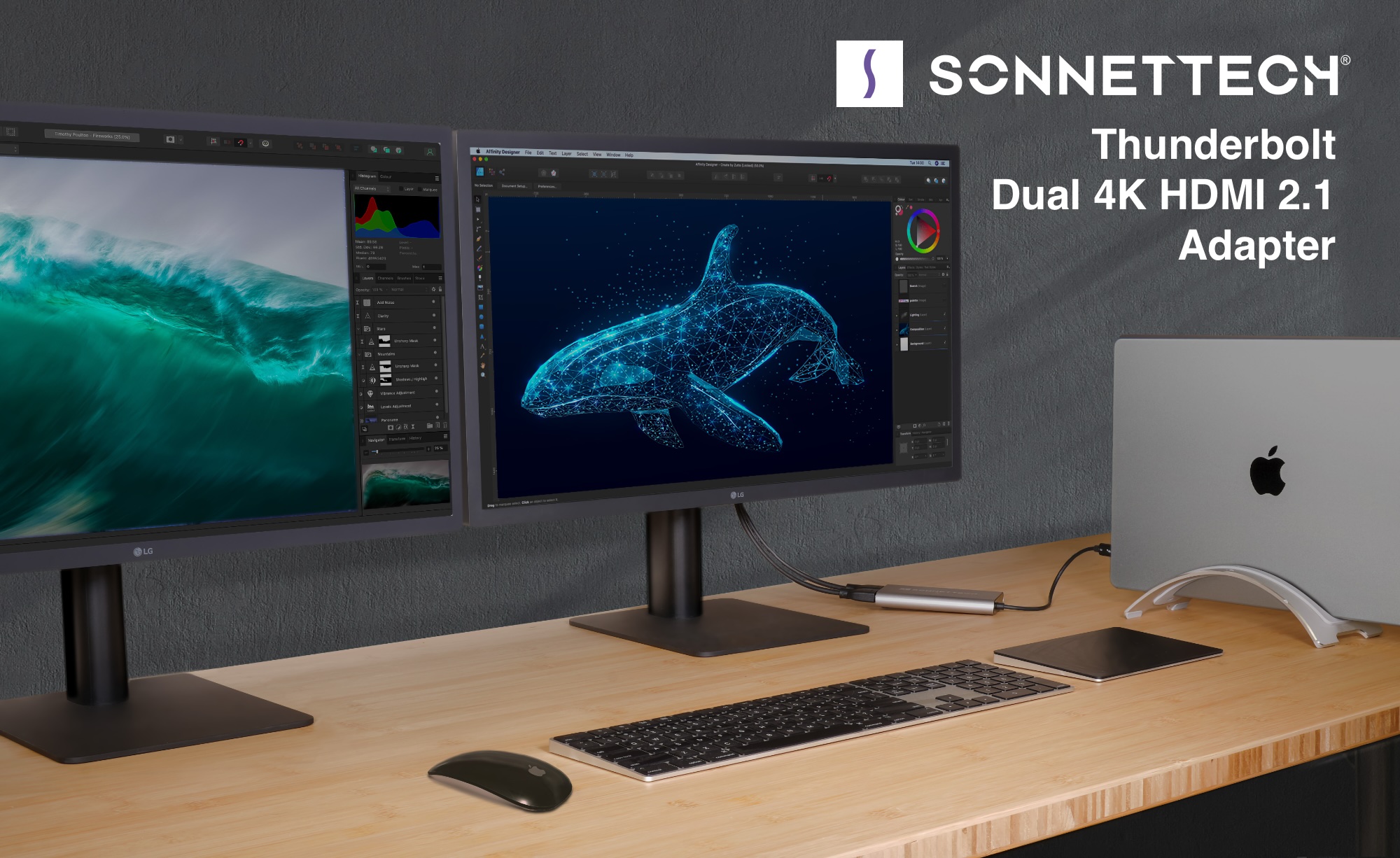A Thunderbolt 3/4 kapu egyik nagyszerű tulajdonsága, hogy kiemelkedő sávszélességet biztosít: 40 Gb/s elegendő ahhoz, hogy számos periféria vagy akár nagy felbontású kijelzők kapcsolódjanak rá. A Sonnettech Thunderbolt 3 Duál HDMI 2.1 adaptere ezt a kiváló képességet aknázza ki, és úgy teszi lehetővé akár két darab 4K kijelző csatlakoztatását, hogy közben csak egyetlen Thunderbolt kaput foglal le a Mac-en.