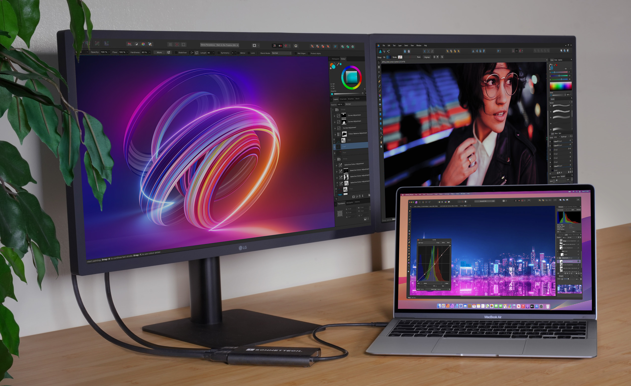 A Sonnet USB-C to Dual 4K 60Hz HDMI Adapter révén professzionális munkahelyet alakíthatunk ki költséghatékonyan akár egy alap mobil Mac segítségével is, jelentős méretű munkafelületet biztosítva.