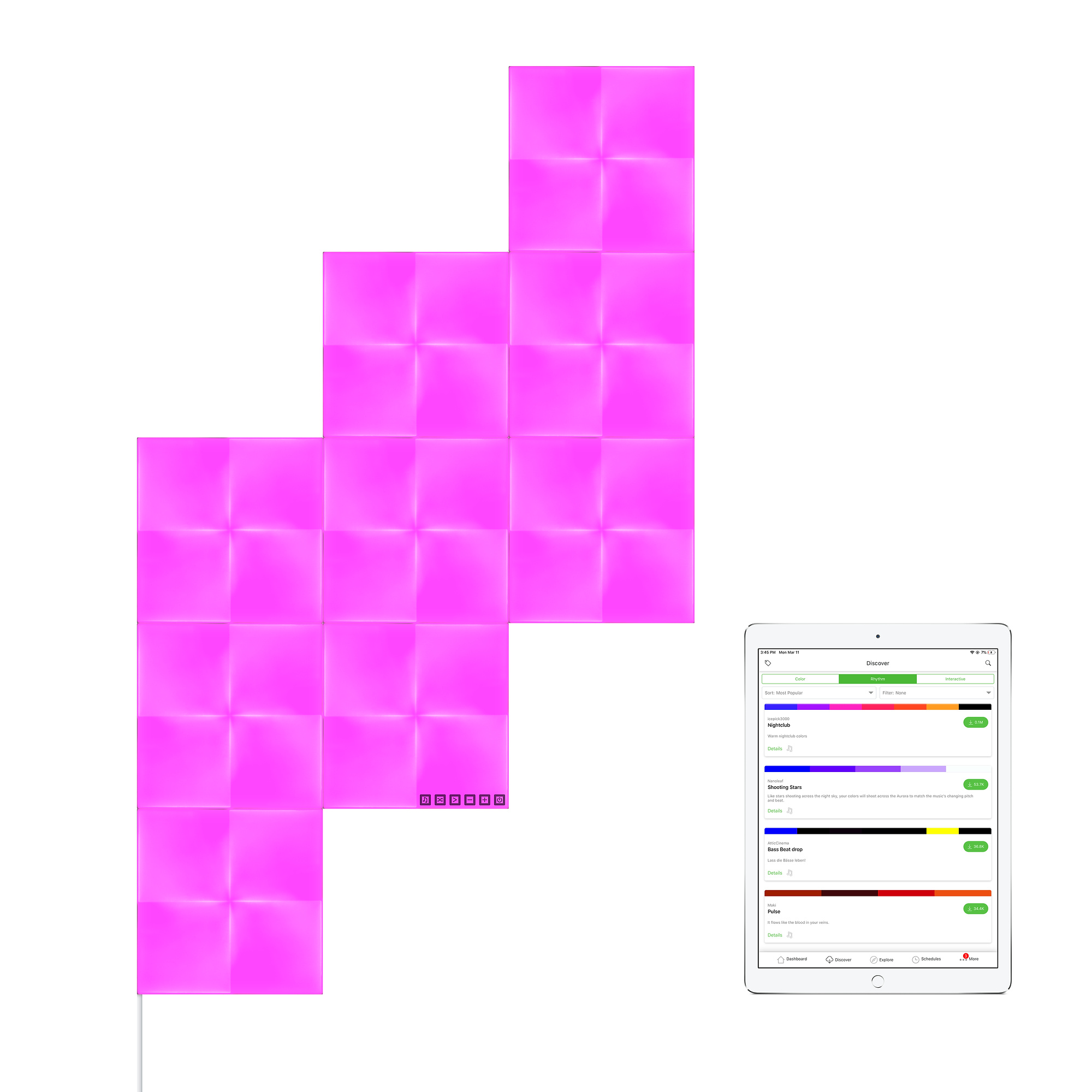 A 100 lumen fényerő nem tűnik nagyon soknak, de már akár hat panel egymás mellett is igen erőteljes fényt nyújt, a bővítésekkel pedig az összesen harminc elképesztő fénypompát biztosít. A Nanoleaf által vizionált csíkok és egyéb alakzatok is igen látványosak tudnak lenni, és a négyzetek révén kikapcsolt állapotban is egyfajta tervezett csempe minta látszik a falon, vagyis akkor is jól néz ki a szett, ha éppen nem pompázik, ha pedig bekapcsoljuk, mindenkit lenyűgöz!