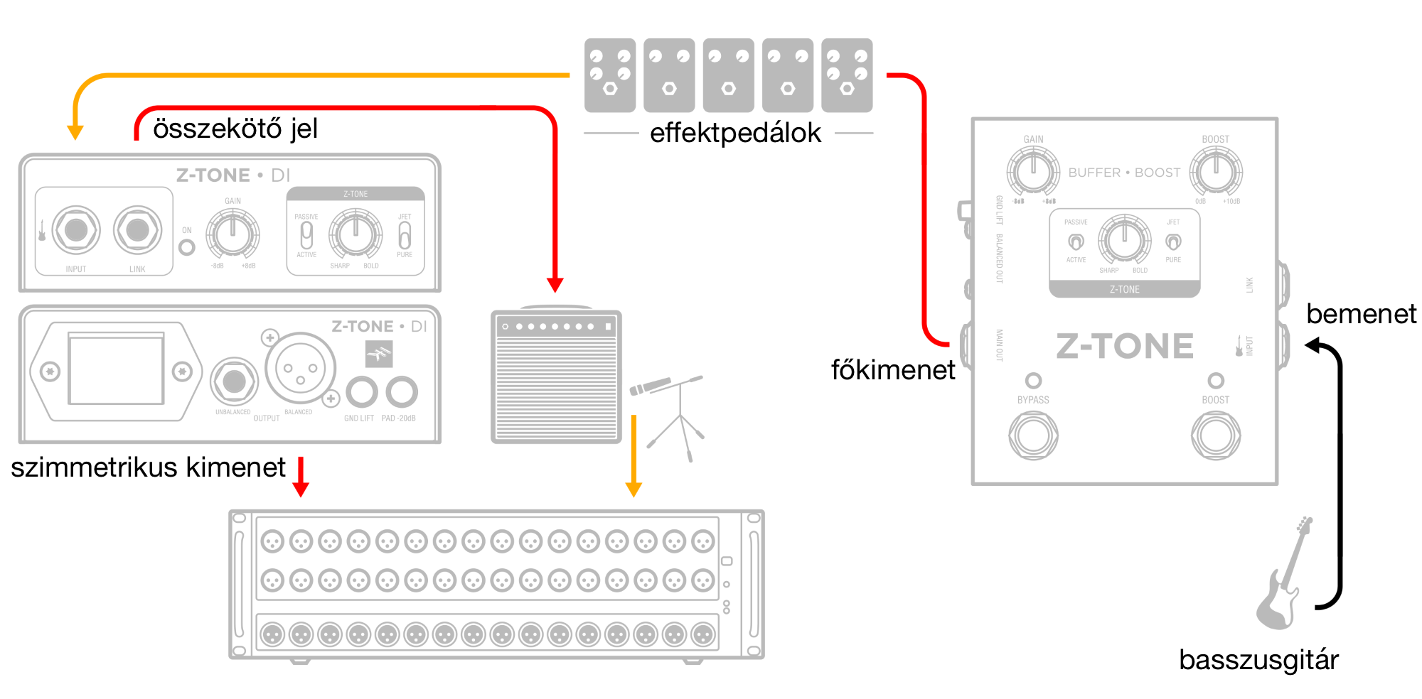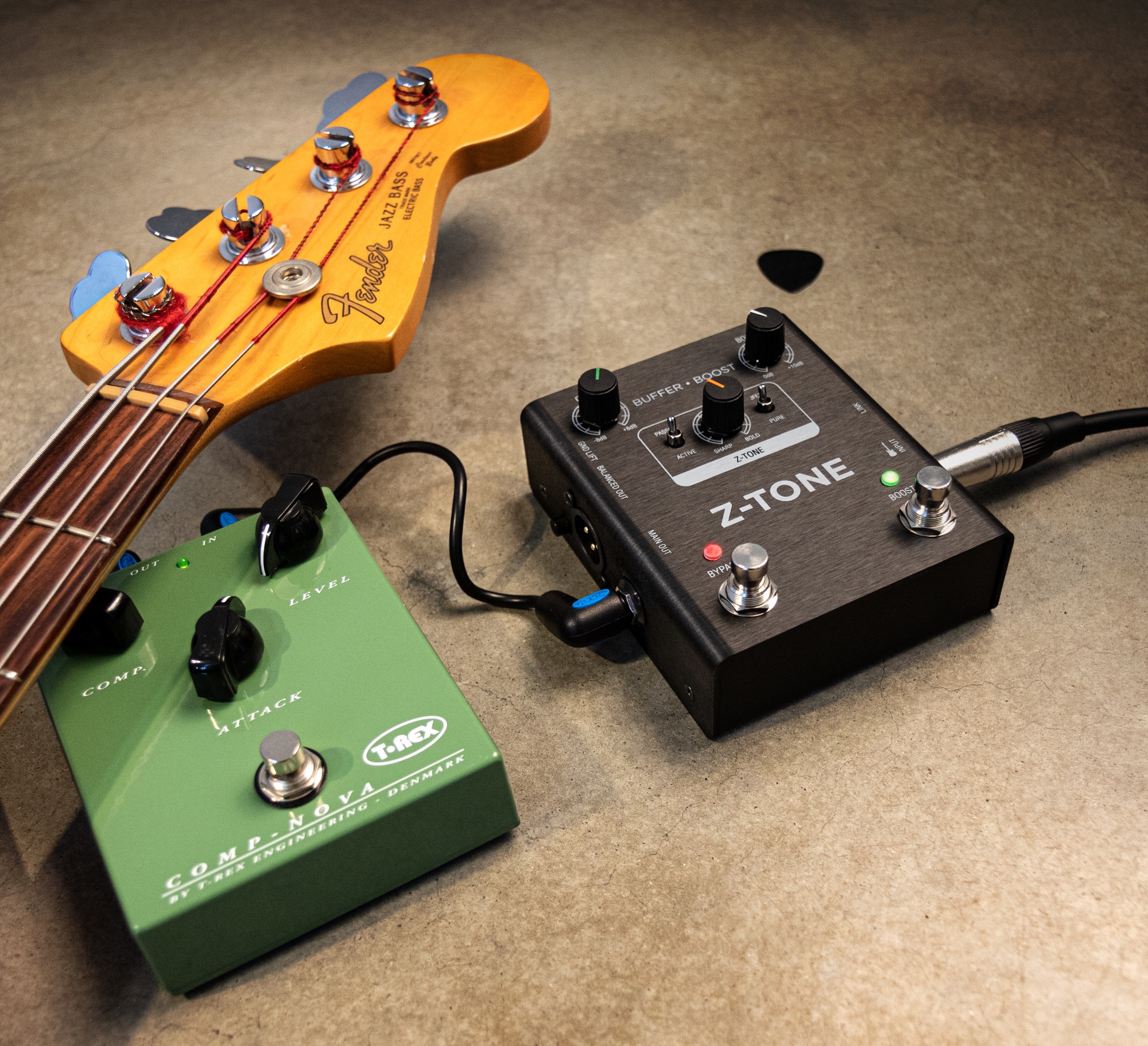 A Z-TONE Buffer Boost ideális első pedál a basszus pedálok sorában. Erősíti a gitár jelét, hogy a pedálokat és az erősítőket a legjobb minőségű jellel és hangszíntisztasággal hajtsa. A Z-TONE vezérlő a gitár vagy a basszusgitár hangjainak új palettáját nyitja meg, és a boost kapcsoló hozzáadja ezt a többletet szólókhoz – maximális szinttel és minimális zajjal. Ebben az összeállításban a Z-TONE DI a jel felosztására szolgál a közvetlen FOH és az erősítő között.