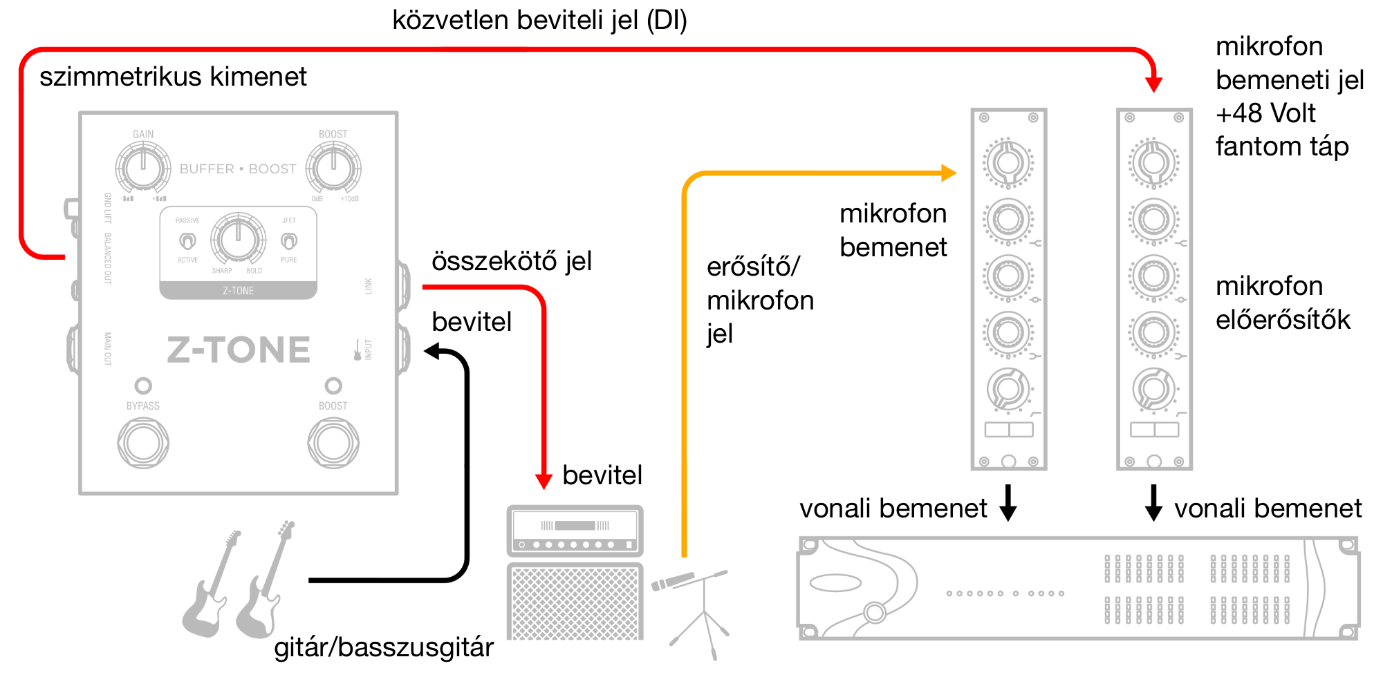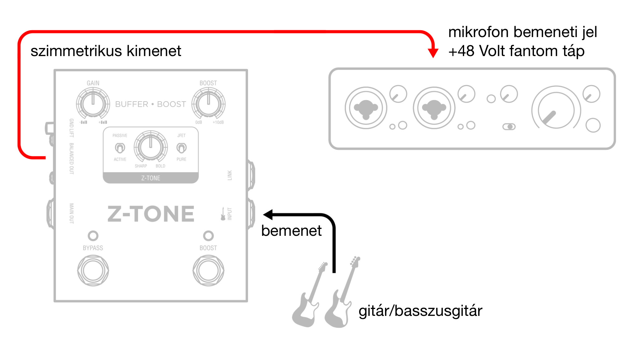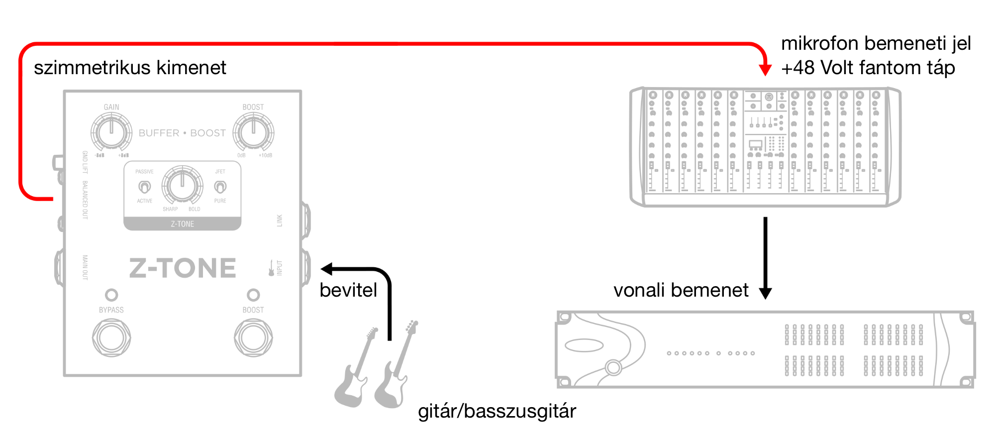 A termék a klasszikus, nem szimmetrikus erősítő és pedál kimenet mellett rendelkezik egy XLR formátumú szimmetrikus kimenettel is keverők és külső gitárerősítők csatlakoztatására. Ezek akkor is használhatóak, ha a Z-TONE Buffer Boost nem végez erősítést, csak a jelet engedi át.