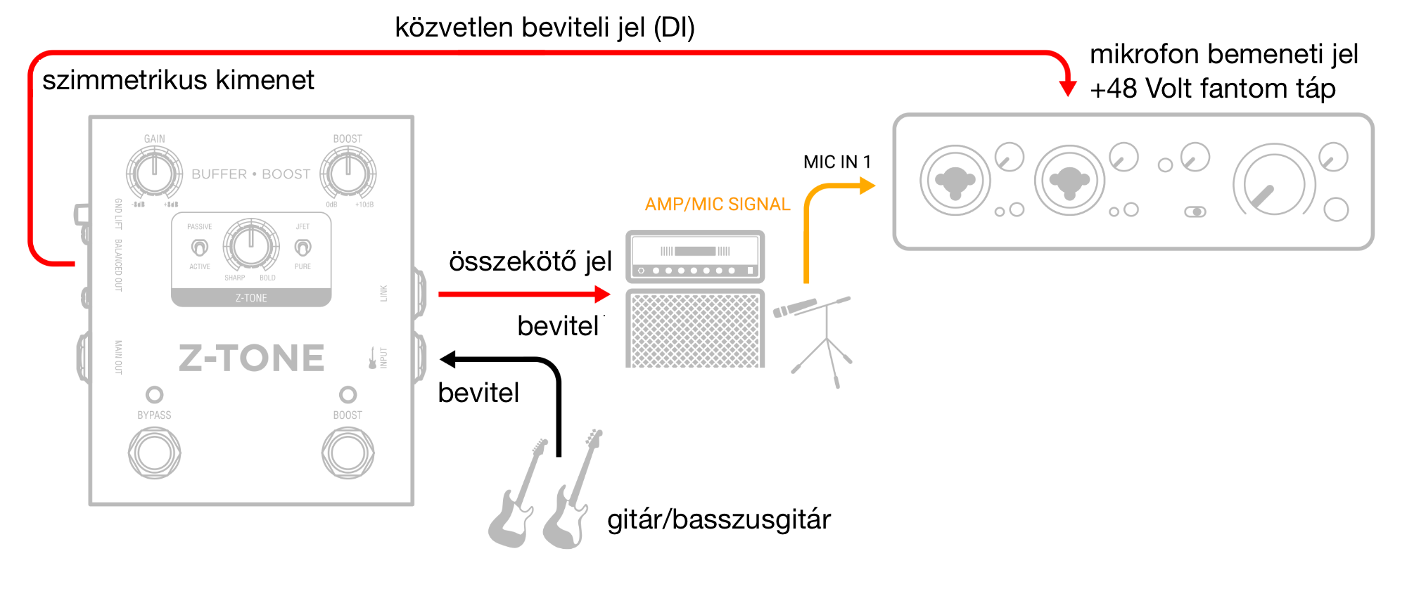 Ez az összeállítás lehetővé teszi egy közvetlen bemeneti gitársáv és mikrofonos erősítő egyidejű rögzítését – a lehető legjobb minőségben – a Mac-en futó szoftverünk irányába akár további bővítményekkel ellátott feldolgozás érdekében. A Z-TONE vezérlés hozzáadásával a 2 mikrofonbemenettel rendelkező audio interfész a legjobb gitár és basszus interfész lehet, a szoftverben pedig rögzíthetjük a nyers gitárhangot és az erősítő kapcsolata révén módosított, erősített gitárhangot is.