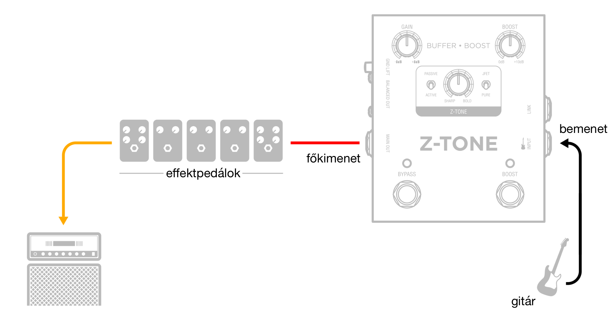 A Z-TONE Buffer Boost egyik fontos funkciója a hangzás markáns fokozása. A beépített Boost áramkör állítható erősítést kínál a hangerő és a meghajtás növeléséhez, erősebb jellel ostromolva az erősítőt vagy a sorba kötött pedálokat.