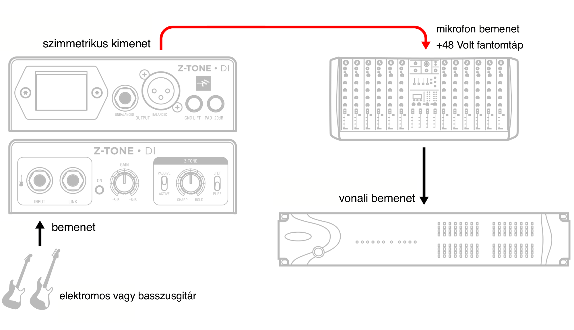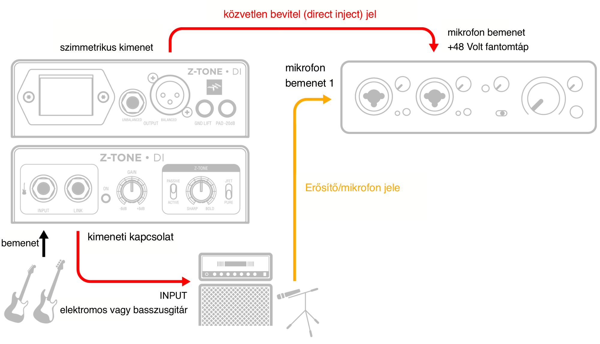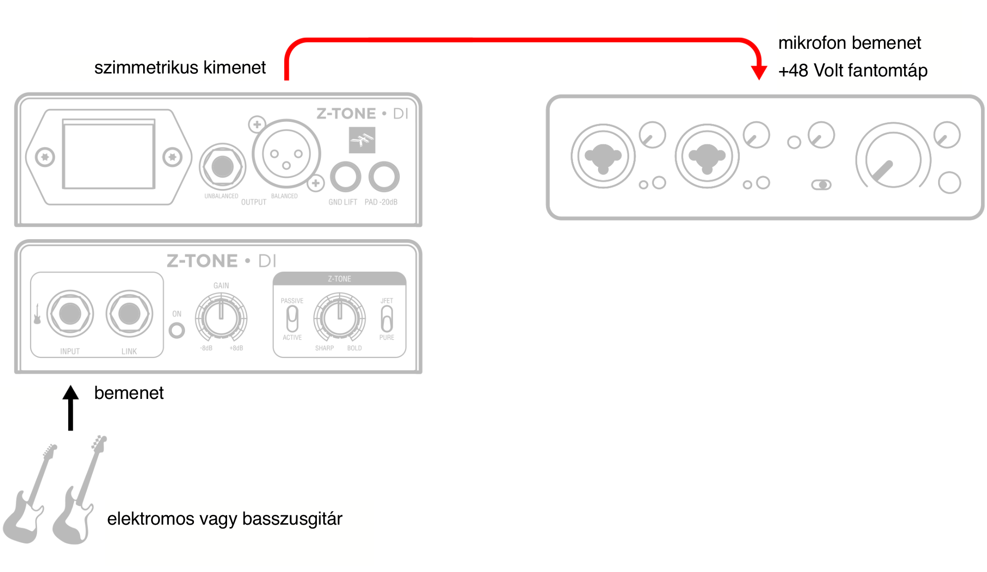Az alábbi beállítás lehetővé teszi, hogy DI gitársávot rögzítsünk a lehető legjobb minőségben a digitális hangfeldolozó alkalmazásban a további bővítményekkel való feldolgozás érdekében. A Z-TONE vezérléssel továbbra is csatlakoztathatjuk meglévő csúcskategóriás modern vagy vintage mikrofon-előerősítőinket, és lenyűgöző gitár- vagy basszushangokat rögzíthetünk.