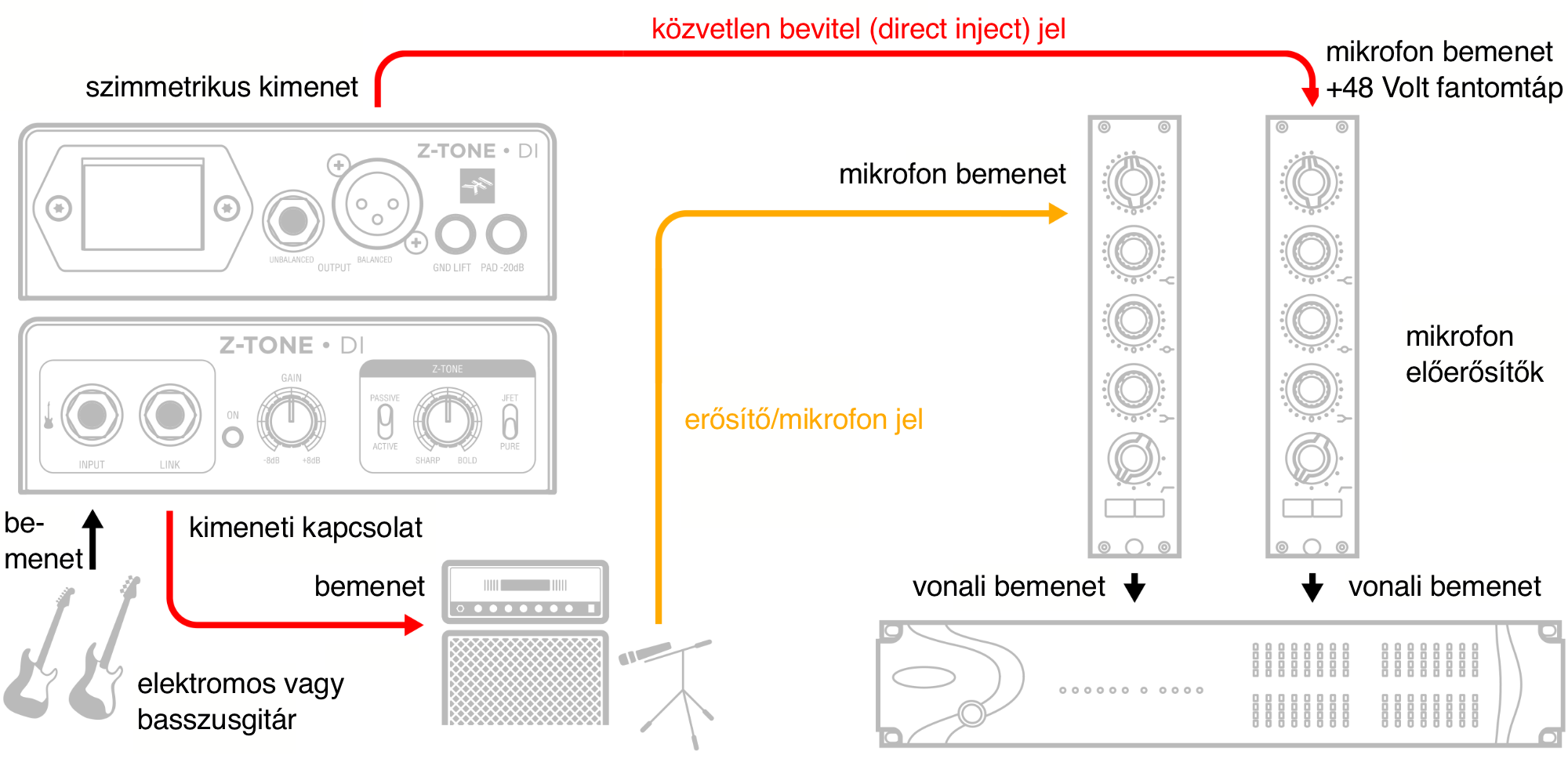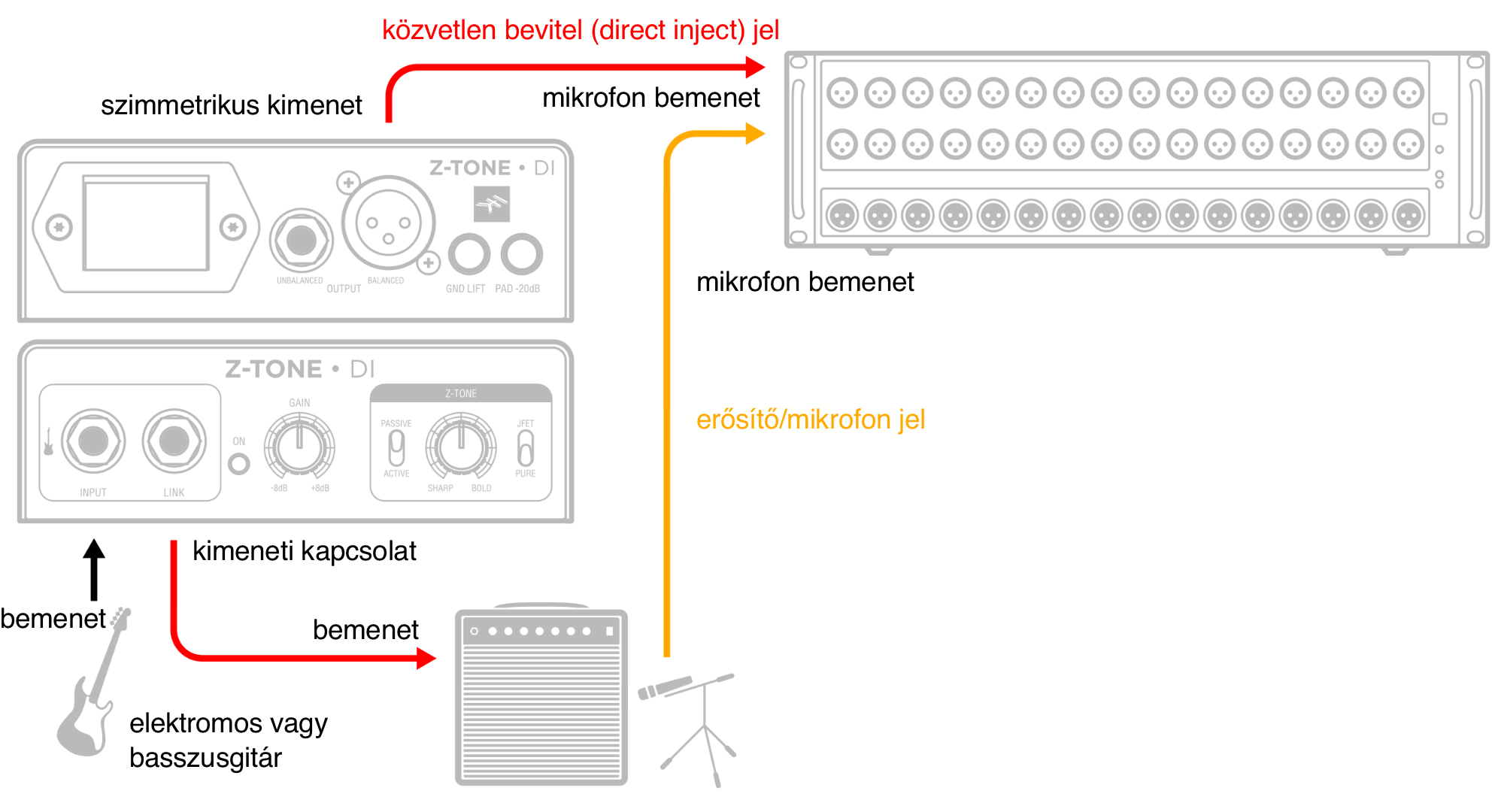 Ez a beállítás ideális élő, kiváló minőségű elektromos basszusgitárhoz. A Z-TONE vezérlés befolyásolja mind a DI-jel hangszínét a nyilvános játék során, mind a színpadi erősítőhöz küldött jelet.