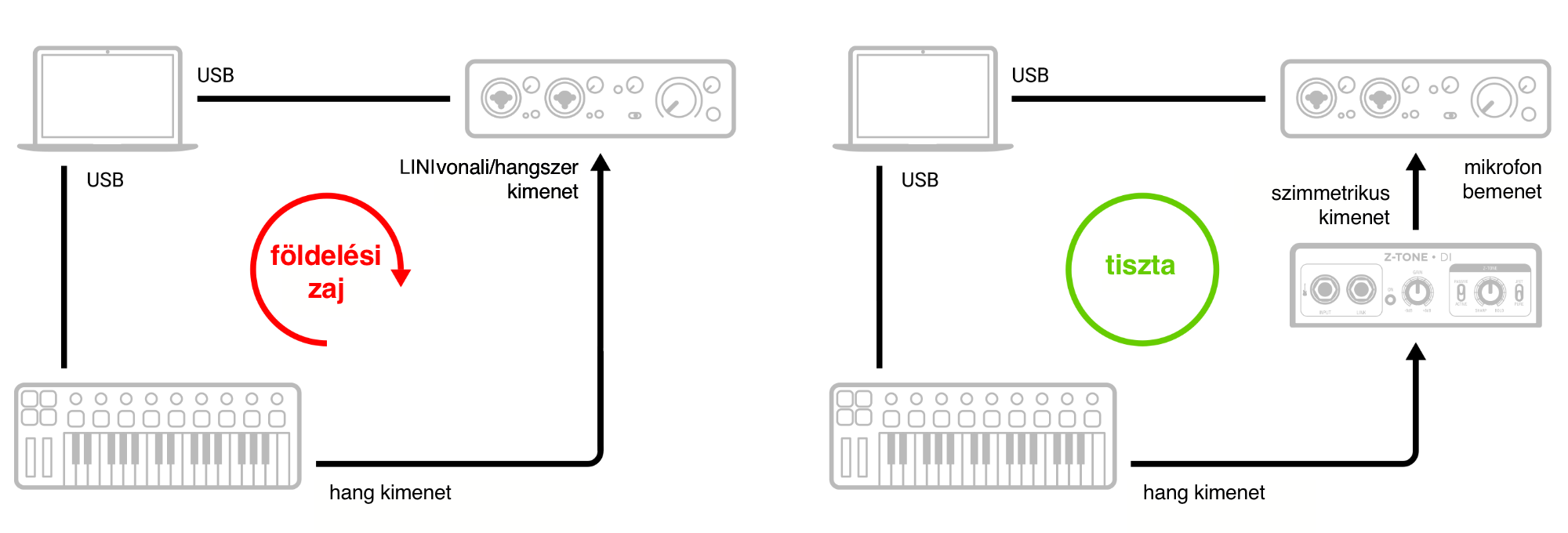 Az USB eszközök számítógéphez, majd audio interfészhez történő egyidejű csatlakoztatása gyakran okozhat zajos földhurkot. A galvanikusan szigetelt Z-TONE DI szimmetrikus kimenet teljesen kiküszöböli a földhurok zaját.