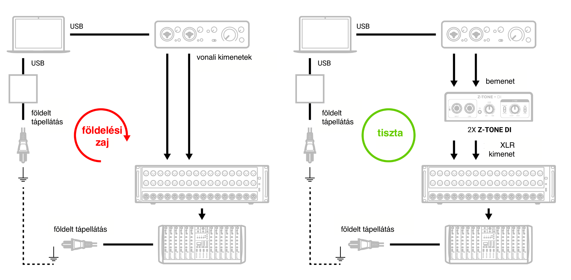 Földelt számítógépek vagy audio interfészek színpadi hangfalhoz vagy színpadi keverőhöz való csatlakoztatásakor zajos földhurok jelenségnek nagy az esélye. A galvanikusan szigetelt Z-TONE DI szimmetrikus kimenete teljesen kiküszöböli a földhurok hatását.